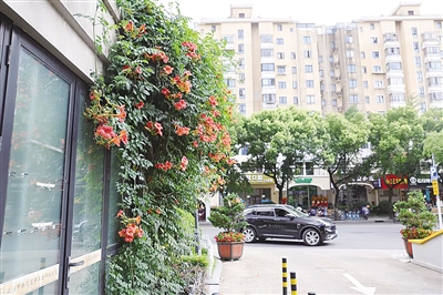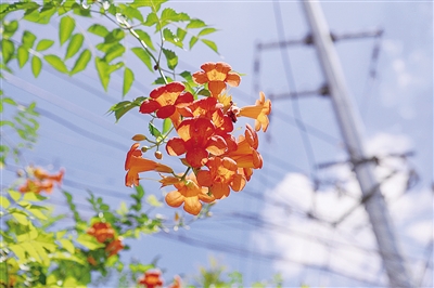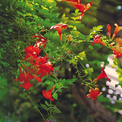 凌霄花的花期一般在6至8月,现在正是盛花期。炎炎夏日,凌霄花冒着酷暑高温绽放美丽,小区回廊,高架桥边……瀑布般倾泻而下的绿叶藤蔓间点缀着点点橙红,给人带来了美的感受。