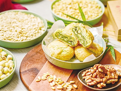 苔条果仁、椒盐百果、上品果仁、玫瑰豆沙、糖醇百果,这五款可谓是最经典的“五朵金花”。苔条果仁,一枚斟满绿意的苔条果仁月饼,仿佛有驱散烦恼的魔力,镶嵌满果仁的苔条馅,散发着海的芬芳,仿佛置身风吹浪涌的海岛;椒盐百果,刚出炉的椒盐百果月饼,潜藏着几分韧劲,椒盐的咸香在一众月饼中显得尤为出挑,大颗饱满的腰果、松子等果仁,松脆可口,让咸甜错落的滋味在舌尖起舞;玫瑰豆沙,上海宁心间的温柔乡,永远是留给玫瑰豆沙月饼的。豆沙细腻,鲜润软糯微甜。温婉绵长的玫瑰香让人心境悠然;上品果仁,集合了松仁、核桃、腰果等食材,与白豆沙搭配相得益彰,金色花瓣般的酥皮簌簌洒落,赏心悦目;糖醇百果,纳藏着玲珑心思,酥软甜润的食感渲染着舌尖,真叫人爱不释口。