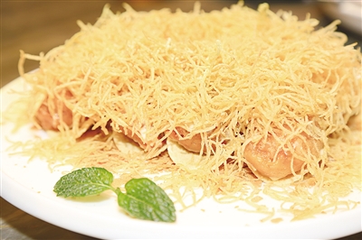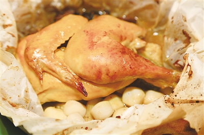4月10日上午十点半,在华泾龙湖天街四楼的“新发现”餐饮店已陆续有客人前来品尝“春味”。据店长何忠海介绍,这次主打吸睛的菜肴也是招牌必点的“龙井芋艿叫化鸡”(图①),但见竹篮托底的小砂锅被端上桌来,裹着一层牛皮纸,打开外包装一股清香扑鼻而来,何店长说,食材来自广东清远的草鸡,一盘半只,蒜头般的白芋头如块块“白玉”装饰其间,雨前龙井茶味浸润汤汁,翡翠面是吃完大半鸡后,倒入盘中浸汁翻滚下,充满茶香、鸡肉香、芋艿香的三重美味随着软糯滑爽的面条进入口腔,触及味蕾,幸福满满。点49元一份龙井芋艿叫化鸡送龙井限定帆布袋一只。