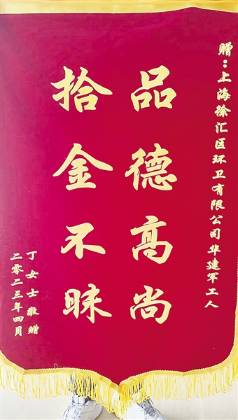 没想到,过了几天,老夫妻俩找到了华建军所在单位上门感谢,这失而复得的钱可是他们的救命钱。原来这笔钱是老两口半年的积蓄,这次为了给老伴看病,刚从银行取出来,装在袋子里放在车篓里,还没到医院突然发现钱不见了。心急如焚地报了警,在警方反馈下,很快就把钱找回来了。夫妻俩为了感谢华建军,特意拿出酬金给他,但都被他谢绝了,华建军拾金不昧的品德打动了丁阿婆夫妻。后来,夫妻俩特地送来一面锦旗,“品德高尚、拾金不昧”正是对华建军的平凡善举的真实写照。