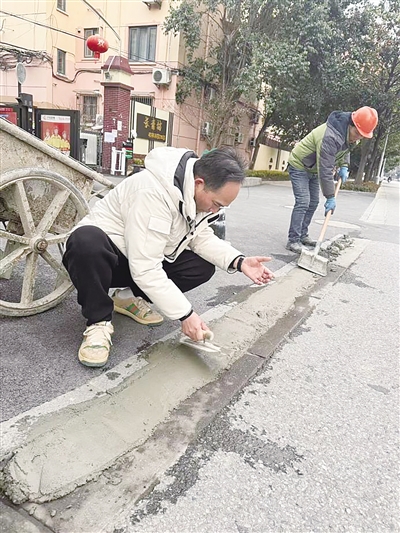 在片区党委的协调下,党总支和“三驾马车”、代建方、施工队多次进行实地勘察,准确测量各种数据,为问题解决提供科学依据。怎么保证在桂林西街路面雨水不倒灌的前提下,降低路缘石与路面的落差?为确保改造工程符合居民利益并得到居民支持,党总支充分倾听居民的意见和建议,多轮讨论后敲定施工方案,决定在路缘石与路面之间砌水泥斜坡。