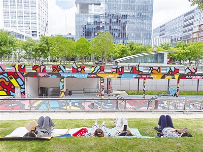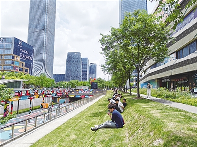 记者采访了一位“躺平”的市民,“我是看小红书推荐来的,太喜欢这片草坡了!晒不到太阳,躺下像在度假一样,可以看到蓝天白云和绿树,真的很舒服。”蓝天、白云、绿荫、微风、阳光,阶梯草坡为周边的工作者提供了一处“偷得浮生半日闲”的休息空间,抬眼就是蓝天白云。这一切恰如设计方Sasaki的设计理念——在繁忙都市中为大家提供一片生态绿色的疗愈之地。