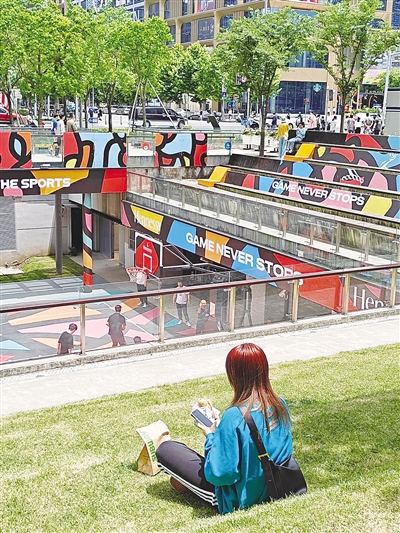 5月20日上午,记者来到GRC·绿地滨江CLUB商场。在商场前方的下沉广场边界,记者找到了这片引发网友热议的阶梯草坡。绿草如茵,阶梯式设计让这片绿地充满了层次感。草坡上方的一排树绿荫,遮去了刺眼的阳光,打工人“藏”在树影里,或躺或坐、有的在闭目养神、有的在轻声交谈,享受着美好的悠闲时光。