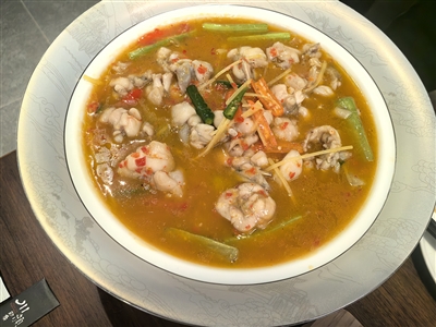 招牌鲟龙鱼,主要做法是水煮贵州鲟龙鱼,分别有重庆麻辣和老坛酸菜等口味。鲟龙鱼的产地采用贵州冷水养殖,水质优良无污染,水温常年在16~18摄氏度。鲟鱼没有肌间刺,非常适合老人和小孩食用。鲟鱼全身都是宝,鱼肉鲜嫩美味,鱼骨清脆软香,鱼皮滑嫩弹糯爽。