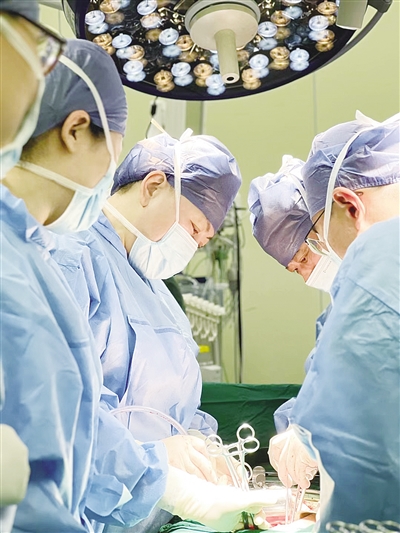 11月30日,滕银成教授主刀,与王治洁主任共同协作,困难钝锐性分开癌性粘连后,为布女士切除了子宫和双侧附件及淋巴结,并进行大网膜、阑尾切除,同步进行“卷地毯样”腹膜病灶切除。术中,外科秦贤举教授上台探查,与普外科傅骏副主任医师共同将结肠肿块切除,部分已有病灶转移的肠段切除,同时行肠管断端吻合,避免后期出现肠梗阻等症状。最后,滕银成教授再次接力仔细探查盆腹腔,切除肉眼病灶。历经数个小时后,经团队同心协力,手术终于取得成功。
