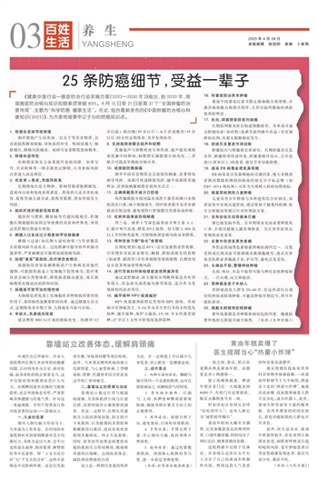 《健康中国行动—癌症防治行动实施方案(2023—2030年)》指出,到2030年,我国癌症防治核心知识知晓率须突破80%。4月15日至21日是第31个“全国肿瘤防治宣传周”,主题为“科学防癌 健康生活”。在此,结合最新发布的《中国肿瘤防治核心科普知识(2025)》,为大家梳理要牢记于心的防癌知识点。