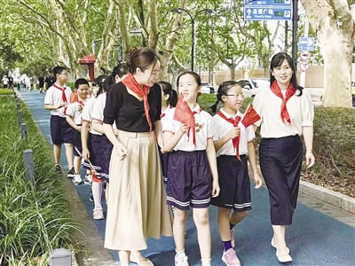 从事少先队工作近十年的施秀梦,始终将“幸福教育”理念贯穿于育人实践中,构建起兼具温度与深度的少先队工作体系。在少年儿童政治启蒙的主阵地上,她创新打造“徐汇印记”主题教育模式,带领队员化身“探秘官”,在“百年上海少年儿童运动史”展陈馆中挖掘本土红色资源,通过“参与式讲解+互动式学习”,让百年党史化作孩子们口中的生动故事。当《领汇》的旋律在徐汇红色地标响起,队员们打着队旗高唱“心中有光,脚下有力量”,以“音乐通感—情感共鸣—价值内化”的路径,让家国情怀在音符中自然流淌。