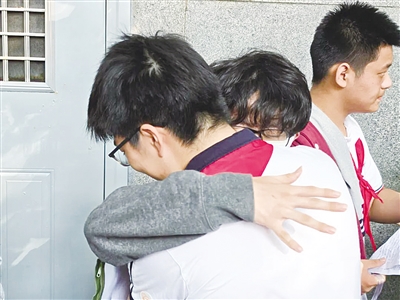 同窗情谊,是青春战场最动人的回响。在位育实验学校考点,前一晚突发高烧的小胡同学十分担忧。同学小戴一个温暖的拥抱瞬间驱散阴霾——“蹭点你的热度,希望我们都能‘火’一把!”这幽默的安慰让小胡展露释然微笑。市二初中考点外,上一届的优秀学子专程赶来,为学弟学妹送上真挚祝福,期待捷报相传。