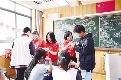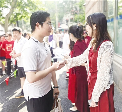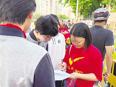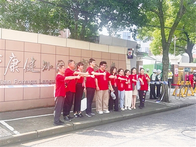 上海市第二初级中学(简称“市二初中”)的校领导、班主任和语文老师们则化身一片“暖心红”,用饱含祝福的拥抱传递力量,语文老师提醒答题规范,班主任则以金色签字笔的创意签到,寄寓美好祝福。园南中学的不少学子都佩戴着象征祝福的红绳手链,那是考试前老师们为他们系上的。